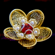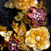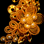 「クロスターアルバイテン」とは、ドイツ語で「修道院の手工芸」と訳さる、一種の宗教芸術です。 15世紀中期の修道院にて始まったとされる、主にキリスト教における聖遺物を祀るために作られた手工芸です。ほぼ純金・純銀メッキ(純度99.8%以上のもの)の高価な装飾ワイヤーや各種貴石、ビーズやパールなどを用いて、高度なワイヤリングの技術をもって額飾り等を作ります。 当時の修道院において、クロスターアルバイテンは巡礼記念の品としても重宝され、大きな利益をもたらしました。 しかし、ルターによる宗教改革などのキリスト教の激動期の動乱の中、多くのクロスターアルバイテンは破壊されてしまいました。 時を経て1980年代にアンティーク・クロスターアルバイテンの作品がオークションなどに出回るようになり、現在その芸術的価値を再認識されています。